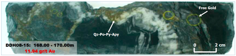 Gold mineralization occurs within a well-defined shear zone and is contained within seven discrete west-striking, north-dipping structures. Gold mineralization is associated with a quartz and sulphide assemblage that consists of pyrrhotite with minor pyrite, arsenopyrite, and chalcopyrite. Free gold is frequently observed in drill core and appears to increase with depth in the deposit.