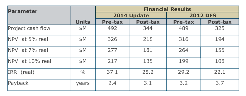 - The update was undertaken in constant US dollars, 100% Project ownership and 100% equity finance basis.